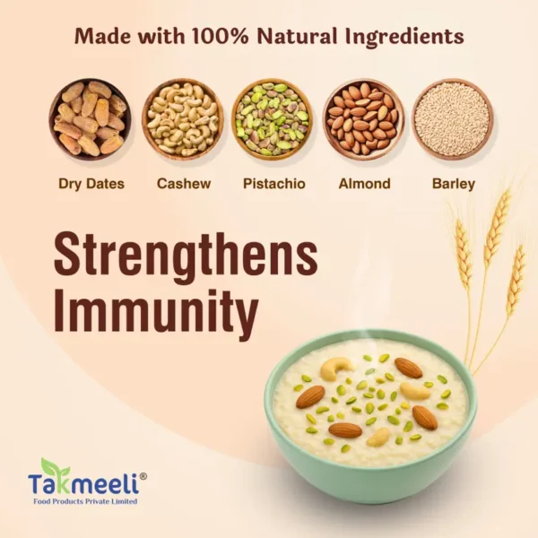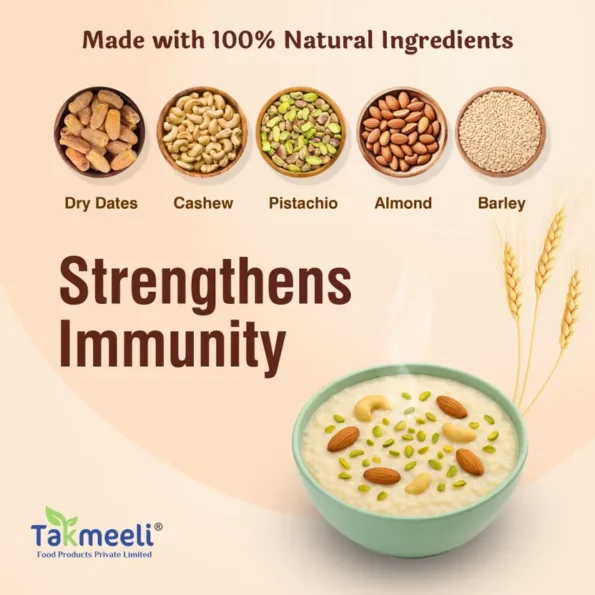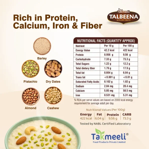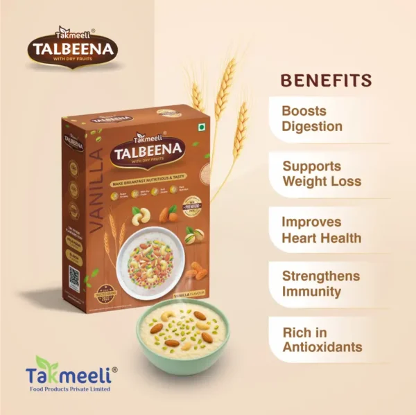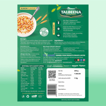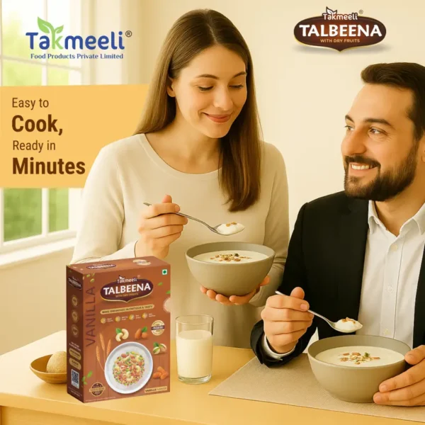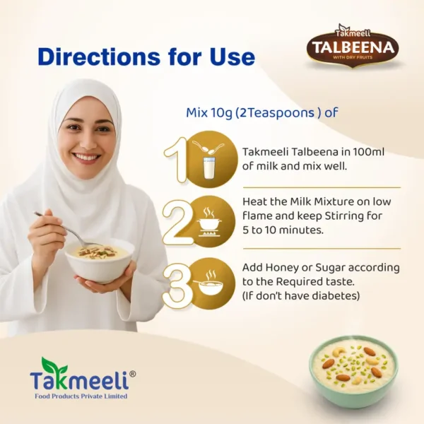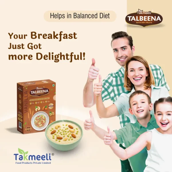 “Talbeena is a pudding of milk, barley and dates. Which has many features in it. It is a complete food that can be taken for breakfast. Its Regular use gives amazing benefits. Exclusively developed by Takmeeli Food Products Private Limited “Takmeeli Talbeena” is a famous and recognized food product of India. It is the only talbeena that has become the highest-selling in more than twenty (20) states of India, based on its taste and health benefits. By using this Talbeena you will get the best taste and good result too, by using this Talbeena you can take care of your health and keep your organs healthy and at the same time you can protect yourself from many diseases. You can also make yourself accustomed to using Takmeeli Talbeena, you can also serve your guests a pudding-style talbeena as a gesture of warm hospitality. And at the same time, by offering Takmeeli Talbeena as a gift, you can proudly fulfill the role of a generous host.”